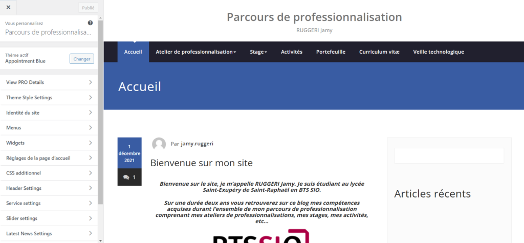 Dans celui-ci on y retrouve un menu, comprenant toutes les catégories de notre parcours professionnel ainsi que toutes les pages comprenant et étant liée au parcours de professionnalisation, des widgets sont également ajoutés au site.