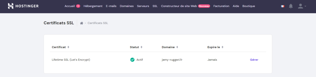 Le choix a donc été porté vers l’hébergeur Hostinger afin de créer mon nom de domaine se nommant (jamy-ruggeri.fr), celui-ci à par ailleurs obtenu son certificat SSL.