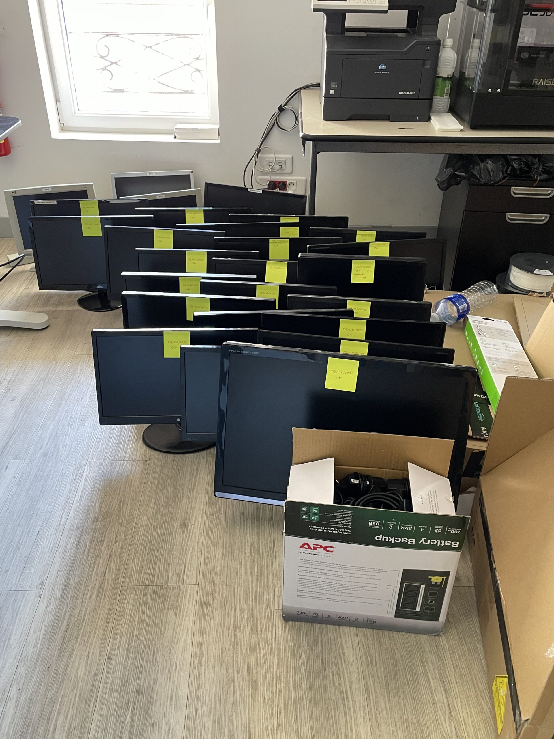 Durant la matinée, test de 27 écrans stocké dans la réserve du SI afin de déterminer leur bon fonctionnement, 26 ont donc été retenus l’un d’entre eux avait un faux contact avec son alimentation. Attribution pour chaque écran d’un câble d’alimentations lui correspondant ainsi qu’un câble VGA dans le but de potentiellement les distribuer aux écoles en cas de besoin.