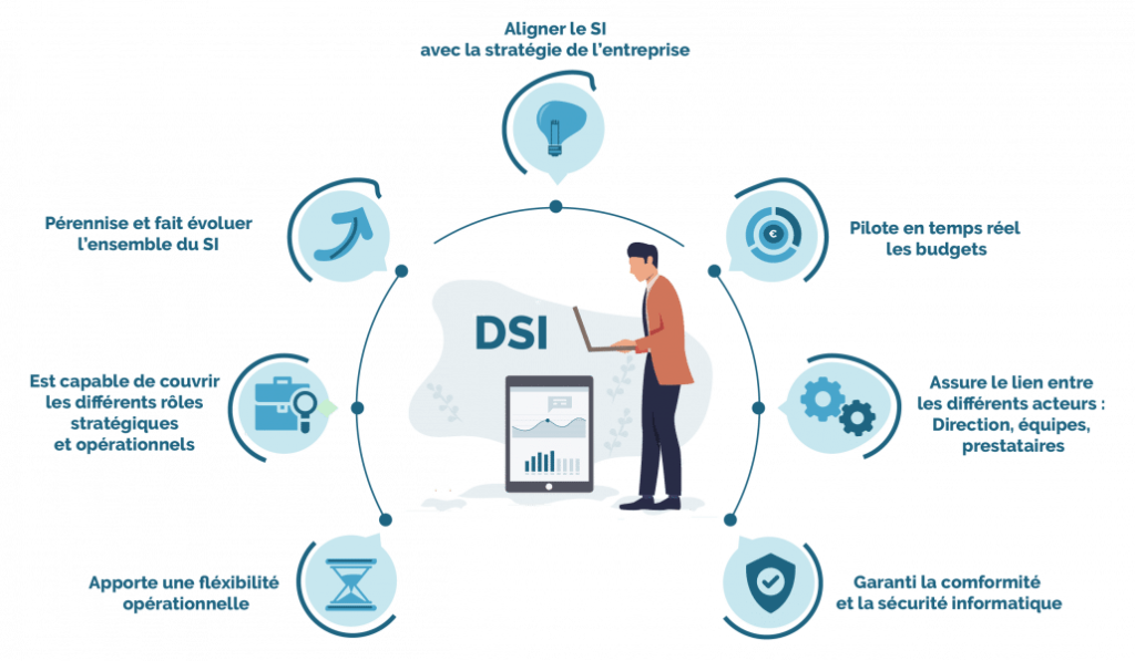 (La DSI est le service responsable du système d’information de l’entreprise. Elle permet à l’entreprise de créer de la valeur en inscrivant son action vers le service rendu à l’utilisateur, mais aussi en prenant en compte la dimension technologique. Son action s’inscrit dans le temps court comme dans le temps long.)